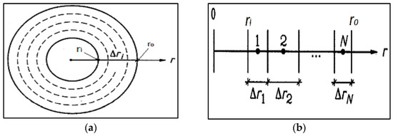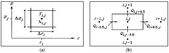 A radial and a vertical thermal process which is rotationally symmetric around the z-axis is considered for this modelling. Here, the interval along ‘r’ is divided into a mesh having cell widths (as shown in Figure 2a) as follows [48,49],