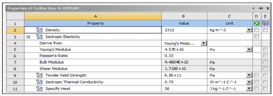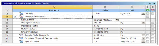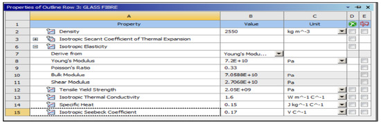 All composites’ materials have been inserted in the engineering data of ANSYS, and all their mechanical properties will be shown from Figure 5, Figure 6, Figure 7, Figure 8, Figure 9 and Figure 10 properties that are most important and need to make sure that they have been entered correctly are the thermal properties such as heat conductivity and specific heat.