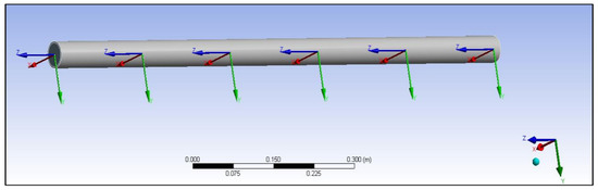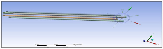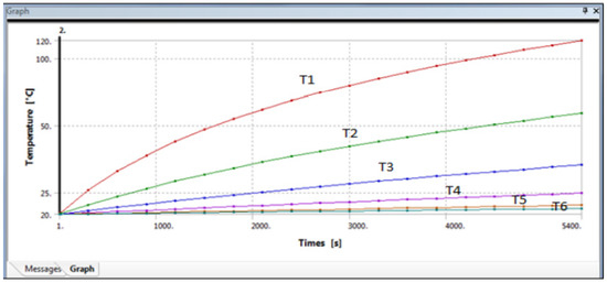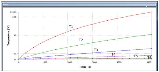 The meshed models were divided into five sections for analysing the heat flow across the composite cylinders. The total length of the cylinder was taken as 10 cm, and each section’s length into 2 cm. The temperature of the beginning of the cylinder was taken as 120 °C, and this model is shown in Figure 13 as follows. The orientation of the five parts in the coordinate system is also given along with in Figure 13.