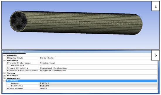 Meshing is the most important tool in computer simulation as it can make the results more accurate, irrespective of whether the simulation is structural, static, or thermal analysis. In addition, meshing is a very useful tool for generating a specific area in the model which needs a focused analysis. This makes the users more comfortable in using it in some specific cases. For example, in the project model, the temperature has been applied to one area in which the finest mesh is required as compared with the rest surfaces where a coarser mesh is sufficient. The different meshes created for each composite cylinder are shown in Figure 11 and Figure 12.