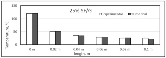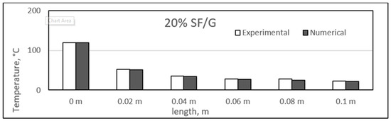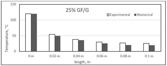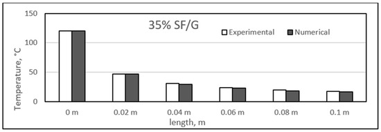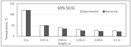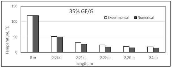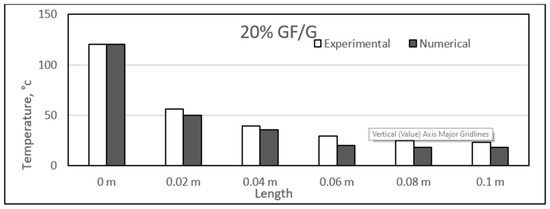 Similar to the sisal fibre composites, the difference in the experimental and numerical values was found for the different glass fibre composite samples. The results for the glass fibre composites are shown in the figure, ranging from Figure 23, Figure 24, Figure 25 and Figure 26. In addition, similar results were also found between both experimental and numerical studies, but in this case, two of the samples showed similarity in the results of both studies at particular lengths. However, in contrast to the sisal fibre composites, a number of numerical temperatures values were higher as compared to the experimental temperatures. For example, the 20%, 30%, and 35% glass fibre composites showed such trends.