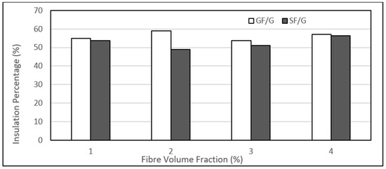 Such a trend was also observed in another study by Patnaik et al. He modelled and experimentally studied the thermal characteristics of glass fibre reinforced epoxy composites having different percentages of glass fibres. He found an increase in the insulation capability of composites with increasing glass fibre contents. However, he found that the insulation capability of the composite was dependent on the glass fibre contents. The insulation capability was increased with the increase in fibre loading, starting from 15%, and, on the other hand, it was decreased slightly beyond 45% loading [55]. Almost similar behaviour is also evident in the figure, and we obtain the maximum insulation percentage at a 25% volume fraction.