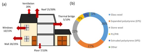 (a) Heat losses for a standard building in France [], (b) European insulation market in 2019 [].