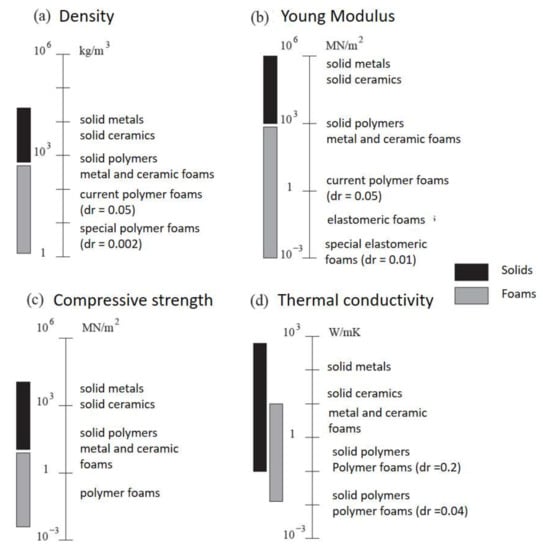 Typical range of values for some properties, i.e., (a) density, (b) Young Modulus, (c) compressive strength and (d) thermal conductivity, of foams depending on their nature (adapted from []).