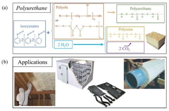 (a) Reaction diagram for PUR and PUA systems, containing (from left to right) the isocyanate precursors, some examples of polyols for the formation of PUR, and, in the presence of water, the formation of PUA and the consequent liberation of CO2; (b) examples of PUR foam applications, such as the thermal insulation of buildings, different polymeric devices, and thermal insulation of pipes.