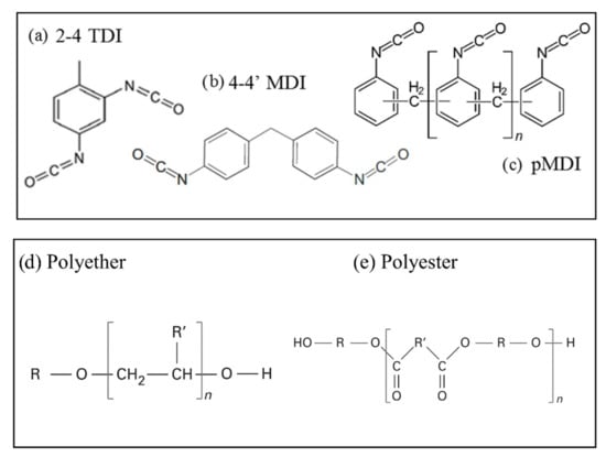 (a–c) Main isocyanates used in the formulation of PUR. General schematic formulations of main polyols used for PUR production: (d) polyether and (e) polyester.