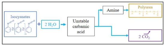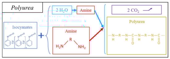 PUA foams can also be based on isocyanate chemistry to produce the polymer matrix (Figure 6). Polyureas generally consist of MDI [,,] or pMDI [,], which, when coming into contact with water, first produce amines, and then polyureas (see Figure 6). Therefore, to maximize the amount of urea formed by the reaction with isocyanates, some studies incorporate amines directly into the polymer blend, such as aniline [] or oligomeric diamines [].