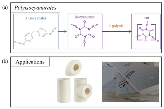 PIR foams have been designed that retain the advantages of PUR foams while improving their thermal behavior and fire resistance []. As a result, PIR foams can be used for construction, thermal insulation, and heating systems, either in panel form or directly foamed on site, [,]. Although their fire performance is superior to that of PUR, PIR foams are dangerous when burned, because they are able to release hydrogen cyanide, a compound that prevents the cells from using oxygen []. The rigidity and strength of this lightweight material also make it attractive for use in the automotive industry [,].