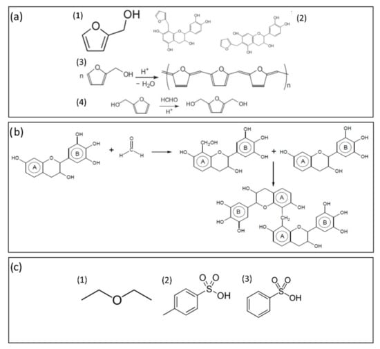 - Foo, L.Y.; Hemingway, R.W. Condensed Tannins: Reactions of Model Compounds with Furfuryl Alcohol and Furfuraldehyde. J. Wood Chem. Technol. 1985, 5, 135–158. [Google Scholar] [CrossRef]