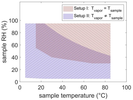 RH/temperature parameter space accessible with setup I (red area) and setup II (blue area). The parameter space for setup II was calculated considering Tvapor = 23 °C.