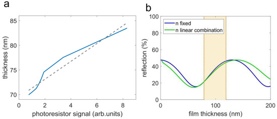 The first part of this study focuses on linking the signal of the custom-built interferometer to the thin film thickness, to obtain a calibration curve for further measurements. For that purpose, in the first place, the thickness of a p(NVCL-co-DEGDVE) thin film sample was measured via spectroscopic ellipsometry at different RH values at room temperature (23 °C), which acted as a reference curve. In the environmental chamber, the photoresistor signal was collected on the same sample at the same humidity levels as the previous experiment and again at room temperature. In Figure 4a, the calibration curve that links the hydrogel’s thin film thickness, obtained via spectroscopic ellipsometry, and the photoresistor signal of the custom-built interferometer, is plotted. Apparently, within this parameter region, linear regression is possible (R2 of 0.95). This trend is also confirmed by the simulation.