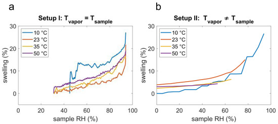 Swelling of the temperature responsive hydrogel at different temperatures and humidity levels, performed with (a) setup I, the custom-built interferometer within the environmental chamber, where Tvapor = Tsample, or (b) setup II, the spectroscopic ellipsometry, where Tvapor ≠ Tsample.