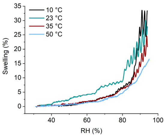 The p(NVCL-co-DEGDVE) is a temperature-responsive hydrogel with a cross-linker amount dependent LCST in the range of 22 to 40 °C, measured in water [20]. The DEGDVE fraction in the hydrogel was 42%, which as Muralter et al. demonstrated, results in an LCST of (28 ± 4) °C [20]. At temperatures below the LCST, the swollen hydrophilic state can be expected, while above, the shrunken hydrophobic state is present. The data presented exhibits the largest swelling at temperatures of 10 °C, which is below the LCST, in nearly the complete relative humidity range, reaching 94% RH, the highest swelling of this measurement series of 27.19%. At temperatures above 10 °C, the sample swelling is less pronounced, reflecting the excellent expected response of a temperature-responsive hydrogel at temperature values above the LCST.