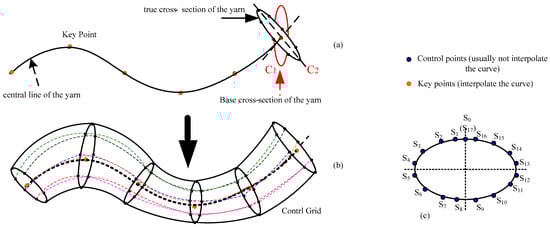 Principle of designing a 3D slub yarn. (a) Schematic diagram of the central curve and base cross-section of a 3D yarn. (b) The control grid for a 3D yarn modelled by B-spline curve. (c) Key control points for the cross-section of a 3D yarn.