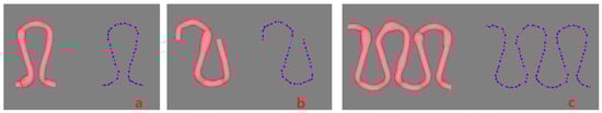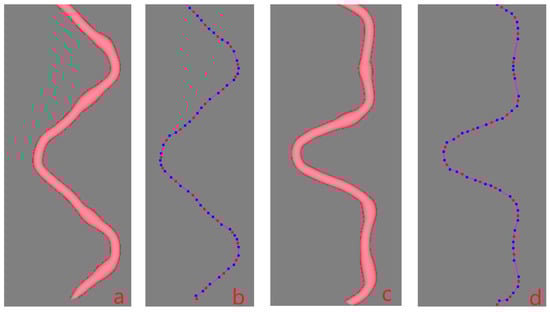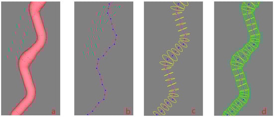 A B-spline curve is determined by a series of control points, but an ordinary uniform B-spline curve does not go through the control points. From a designer’s perspective, the curve is expected to go through all the key points or interpolating points to ensure its shape. In order to meet the requirement, the inverse calculation is generally adopted, which is easily disturbed by the fluctuation of boundary conditions, however. To solve the problem, a robust algorithm was proposed in Zheng [7] that inserting additional control points would ensure the curve goes through the key points. Figure 3a shows an uneven yarn that goes through the given key points. The red dots are the key points controlling the central curve of the yarn as shown in Figure 3b. Two blue dots are automatically generated and inserted before and behind each red point (two end key points are excluded), as shown in Figure 3b, respectively, and each red key point locates at the midpoint of the segment line connecting the adjacent blue dots. Figure 3c shows the cross-sections of the yarn corresponding to all key points, and the sections are perpendicular to the center curve. Figure 3d shows the yarn control grid formed by connecting the control points of all cross-sections. To produce a uniform yarn, all the base cross-sections should be kept unchanged. If the base cross-sections are different in shape or size, an uneven 3D yarn with a slub effect will be modeled. When there are some larger cross-sections in a short distance, and then a slub knot will be designed. Therefore, each slub knot presents two aspects: the center of the cross-section and the shape of the cross-section. If a long slub knot is expected, and then there will be a long distance between the two key points where the two corresponding cross-sections are both larger than the normal one in size.