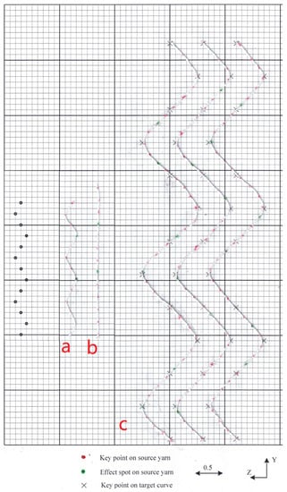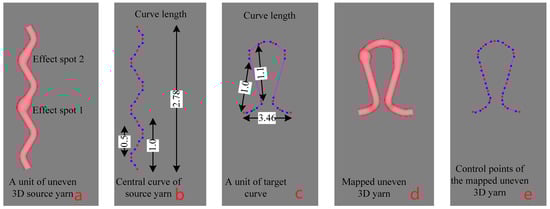 To reflect an irregular/uneven 3D yarn in the fabric structure, it is necessary to investigate how the effect spots change their spatial positions when the central curve of the yarn changes freely. Figure 4a shows a 3D slub yarn with two knot effects in a repeat unit. If the central curve of the yarn changes from Figure 4b to Figure 4c, the change in the positions of the knots is shown in Figure 4d. In this converting procedure, the control points for the central curve of the new yarn are shown in Figure 4e.