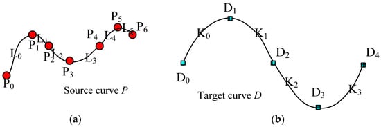 The key-point-mapping processes are illustrated in the following diagrams. In Figure 5, we assume that central curve P of the source yarn is controlled by the sequence of key points {P0, P1, …, P6}, which are also the centers of the base cross-sections. In Figure 5, target curve D is controlled by the sequence of key points {D0, D1, …, D4}, which actually describes the geometric path of the yarn in the fabric structure. The change in curve D means the change in the geometry of the fabric. According to the algorithm of modelling the SPQUCBSC, curve lengths between every two neighboring key points along curve P are {L0, L1, …, L5} as shown in Figure 5a. For curve D, the curve lengths between every two neighboring key points are {K0, K1, …, K3} as shown in Figure 5b. In order to ensure that the new yarn has a path following that of target curve D and maintains the contour of the cross-sections as in surface Y, the key points of curve P and curve D are combined to form a new central curve D1 as the central path of the new yarn. The simplest mapping method is that P0 on the point curve P corresponds to point D0 on curve D. The key mapping steps are described as follows: