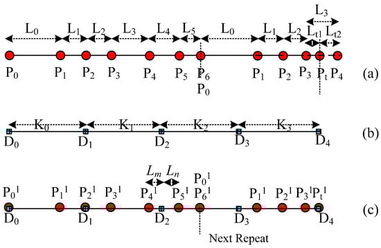 The calculation of key point spacing along the central curve and the combination of the sorting of key points. (a) Calculate the distance to the mapping start P0 for each key control point on the source yarn. (b) Calculate the distance to the mapping start D0 for each key point on the target curve. (c) Combine and rearrange all the key points of both source yarn and target curve in order on the new central curve according to the distances to the random mapping start P0 or D0.