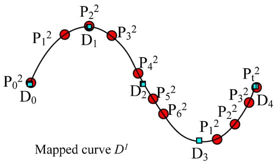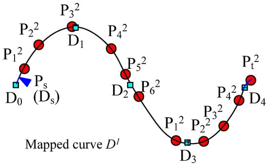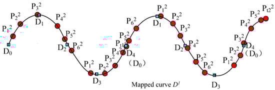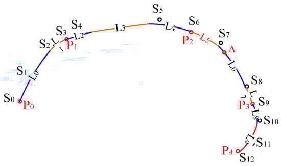 Figure 11 shows the curve interpolating five red key points, i.e., P0, P1, …, P4. To form such a shape-preserving curve, a sequence of 13 (5 × 3 − 2 = 13) control points {S0, S1, …, S12} is required. The curve comprises 10 (13 − 3 = 10) curve segments, expressed as {L0, L1, …, L9}. Each curve segment Li (i = 0, 1, 2, …, 9) is a cubic polynomial with different multinomial coefficients. These 10 curve segments form a complete quasi-uniform cubic B-spline curve.