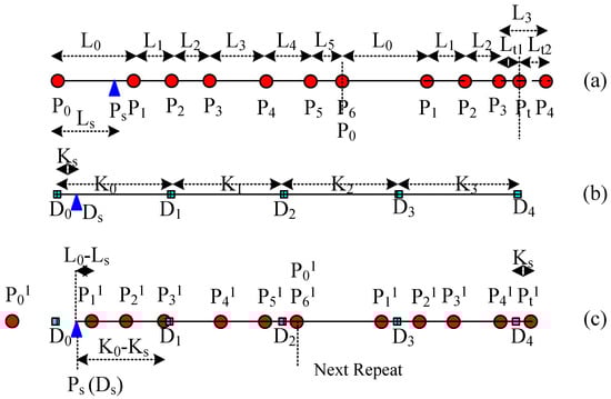 In actual fabric design and manufacturing, in order to avoid Moire effects in a large area in warp or weft directions and forming defects, the mapping starting point of warp or weft yarn should be randomly changed purposely. When considering the fabric width, the starting point of the source yarn and the target curve must be different at two adjacent weft yarns in continuous weft picking. Therefore, the starting point of the mapping of the source yarn, Ps, is generally not the first key point of the source yarn, or P0; and the starting point of the target mapping curve, Ds, is not its first key point, D0, either, as shown in Figure 8a,b, respectively. Let us suppose that the distance from Ps to P0 is Ls, and the distance from Ds to D0 is Ks. In Figure 8c, although Ls < L0 and Ks < K0, actually Ls and Ks are arbitrary values without any restriction. In calculating Pi2, the key point on the mapped curve, the pair of the starting point Ps and Ds are both located at the distance Ls–Ks from D0 on the mapped curve, as shown in Figure 8c and Figure 9, respectively.