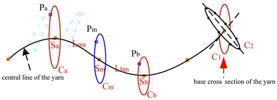 (3) According to the curve length between 2 adjacent key points along the source yarn P, the key point of the source yarn Pi (i = 0, 1, …, 5, and i is an integer number in this paper) corresponds to point Pi1 on the new curve D1. Meanwhile, the contour of the corresponding base cross-section at Pi on curve D is obtained and assigned to the base cross-section at Pi1 on curve D1.