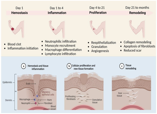 Wound healing must be seen as a sequence of regulated and interconnected steps, as shown in (Figure 1), such as coagulation, inflammation, deposition, fibroplasia, extracellular matrix differentiation, contraction, remodelling, and epithelialization [1]. Acute wounds should recover in two to three weeks at most, followed by the remodelling stage, which may take up to two years. Scab development and little to no infection are signs of routine healing. When an infection exists, the immune system often fights it off. However, in cases of severe microbial disease, the immune system cannot eradicate the condition, and the wound develops to the chronic stage and fails to heal sequentially in the expected time frame. Chronic wounds are difficult to keep clean and are more vulnerable to bacterial infections [2,3,4,5]. A high level of bacterial invasion distinguishes these wounds, as well as increased inflammation, reduced oxygenation on the subepithelial tissues, damaged fibroblast, and postponed re-epithelialization [6,7]. Leg ulcers, pressure ulcers, diabetic foot ulcers (DFUs), fungating wounds, and other chronic wounds are among the most typical [8,9].