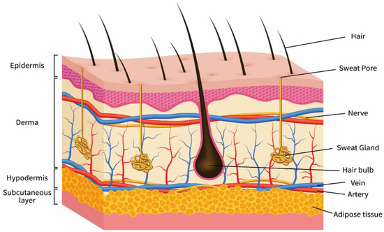 The skin is a semipermeable membrane that serves as a defence against harm and protects the structural integrity of the human body. It is the most crucial multifunctional organ in the human body, performing critical tasks while defending the body’s internal tissues against pathogens and excessive water loss [16,17]. Figure 2 depicts a generic skin schematic. The epidermis, dermis, and hypodermis are the three primary layers of the skin. The significant functions of the epidermis are to prevent pathogenic microorganisms from entering the body and to keep the body hydrated. The stratum comprises five layers: basale, spinosum, granulosum, lucidum, and corneum, forming the skin epidermal layer. These layers include a variety of non-immune and immune cells (such as Merkel cells, melanocytes, keratinocytes, Langerhans cells, and stem cells). Keratinocytes, which contain spinous, granular, and outermost stratum corneum layers, are produced by the proliferative component of the epidermis. Some regions of the body, such as the foot soles and skin palms, contain an extra stratum lucidum. The stem cells in the basal epidermis regulate the regeneration of injured skin and the restoration of keratinocytes lost by exfoliation. The dermis layer is placed between the epidermis and hypodermis and comprises blood vessels, nerve cells, collagen, hair roots, mesenchymal stem cells, and lymphatic vessels. The dermis’ primary job is to provide structural hardness to the skin. The hypodermis is the subcutaneous fat layer that supports the epidermal and dermal layers and comprises fibroblasts, adipocytes, vasculature, macrophages, and nerves [18,19].