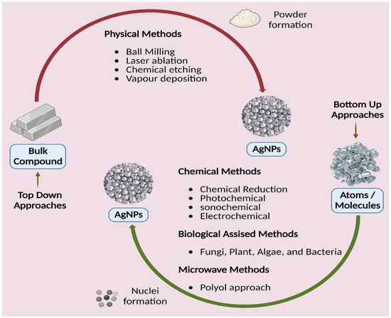 AgNP is synthesized using either a top-down or bottom-up method, as is typical for most nanomaterials, as illustrated in (Figure 5) [94]. Physically breaking down a large complex into smaller parts is a critical component of the top-down strategy. Physical and mechanical procedures such as UV irradiation, lithography, laser ablation, ultrasonic sounds, and photochemical reduction create a strong energy/force to compress the macromolecule into nanoparticles [95]. The physical reduction procedures generally have quick processing durations, yielding AgNPs with a restricted size distribution range. However, they have several drawbacks, including the tremendous amount of equipment space needed, the extended time required to obtain thermal stability, the energy-intensive nature of the methods, and the difficulty in easily using them for scaling-up reasons [96]. When creating nanoparticles from the bottom up, tiny particles such as atoms and molecules are used as the building blocks. These smaller particles come together to form a complex nanoparticle by self-assembly or aided assembly. Chemical, microwave, and biological approaches are subcategories of the bottom-up strategy. For the manufacture of AgNPs in solution, chemical techniques are often utilized. They are produced in water or other organic solvents [97]. Chemical processes are quick and practical but represent a severe environmental risk because they use hazardous substances as reducing agents and create dangerous byproducts.