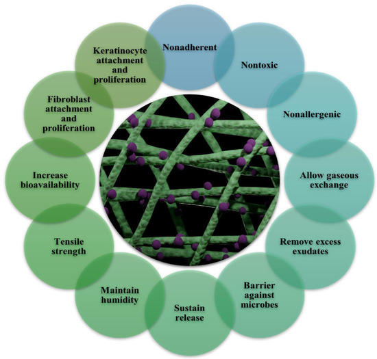The ideal wound dressing should fulfill a number of criteria, including those listed below: (i) representing a physical barrier that is permeable to oxygen while also maintaining or providing a moist environment; (ii) being sterile, non-toxic, and protective against microorganism infections; (iii) providing an appropriate tissue temperature to favour epidermal migration and promote angiogenesis; and (iv) being non-adherent to prevent traumatic removal after healing. An ideal wound dressing should have all the qualities listed above, but it is challenging for one kind of dressing to meet every one of these needs. Creating a moist wound environment reduces dehydration and cell death. It facilitates angiogenesis and epidermal migration. It preserves moisture at the site of the wound. Excess exudate must be removed for the wound to heal, but it can also cause healthy tissue to macerate, creating a persistent wound. It enables gaseous exchange. Oxygenation regulates exudate levels and promotes fibroblast and epithelial growth. It prevents infection by prolonging the inflammatory phase and preventing epidermal migration and collagen formation; microbial infections slow the healing of wounds. Low adherence and painless removal of adherent dressings can be uncomfortable and can worsen existing granulation tissue damage. The cost-effective and optimal dressing should promote wound healing while remaining reasonably priced [128,129,130]. The main categories of wound-dressing materials are fibers, gels, membranes, films, sponges, and hydrocolloids, as shown in (Table 2). Nanofiber mats are a superior option for drug delivery compared to all other biomaterials because of their numerous advantages and inherent properties, as shown in (Table 2). The incorporation of nanoparticles into nanofiber scaffolds constitutes a novel approach to “nanoparticle dressing” that has acquired significant popularity for wound healing (Table 2). Due to their remarkable antibacterial capabilities, silver nanoparticles are attractive materials for wound healing. Numerous wound-dressing materials have been created in this area (Table 3), based either on synthetic or natural polymers.