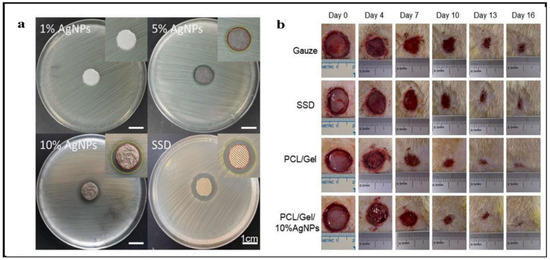 The silver loaded nanofiber network has shown notable characteristics in wound healing applications (Figure 7 and Figure 8). There are increasing studies on using AgNPs in wound dressings, and all outcomes promoting wound healing are positive [165,166,167]. C. He et al. prepared antibacterial wound dressings whose outermost layer was hydrophobic, which inhibited external microbe adhesion and invasion. Invading microorganisms could be hampered by a specially engineered intermediate region with a high concentration of AgNPs. The polycaprolactone and gelatin hydrophilic surface was employed as the inner layer adhered to the wound bed. The antibacterial activity of the nanofibers containing 10% silver nanoparticles was much higher than that of the dressings containing 1% and 5% silver nanoparticles (Figure 10a). Furthermore, the biocompatibility was far better than that of commercial silver sulfadiazine. This layer also worked as a screen to prevent cytotoxicity from the abundant discharge of AgNPs in the wound’s immediate vicinity. According to the results, the wound dressing’s sandwich structure provides good antibacterial activity and cytocompatibility. The findings pave the path for developing more clinically-relevant wound closure and healing dressings (Figure 10b) [168] AgNPs were evenly distributed throughout the fibers. The XRD patterns of AgNPs and PCL/Gel-AgNPs are depicted in Figure 11. The characteristic peaks at approximately 38° and 44° corresponded to the (1 1 1) and (2 0 0) planes of AgNPs, respectively, proving that AgNPs were successfully doped.