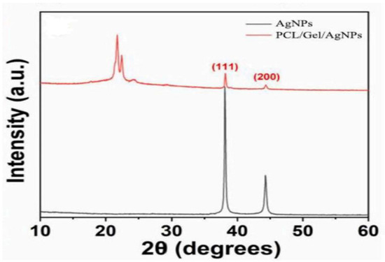 XRD patterns of AgNPs and PCL/Gel-AgNPs. Images reproduced with permission from [168] ©2021 Materials Science & Engineering C. Published by Elsevier Ltd. (Amsterdam, The Netherlands).