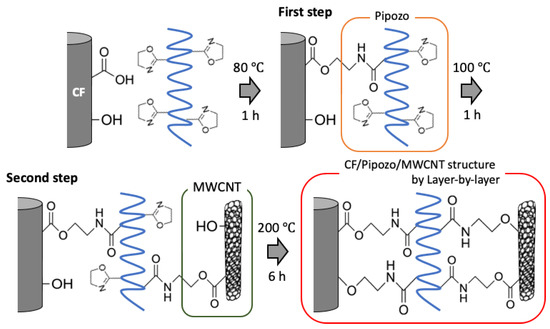 Under the present conditions, the chemical bonding for the two interfaces between CF and Pipozo, and between Pipozo and MWCNT, was only between COOH and oxazoline, i.e., without chemical reaction between phenol-OH and oxazoline, which requires a higher temperature for the reaction. To realize stronger bonding between MWCNTs and CFs through Pipozo, additional heat treatment at 200 °C for 6 h was performed to promote the reaction between phenol OH and oxazoline, between CFs and Pipozo, and between MWCNT and Pipozo. The MWCNTs were chemically grafted onto CFs through Pipozo, which is represented as CF/Pipozo/MWCNT, as illustrated in Figure 1.
