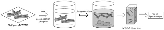 Figure 2. Process to remove MWCNTs (the second layer) from CF surfaces by Pipozo (the first layer) through the decomposition of Pipozo and the complete elimination of MWCNTs from the surfaces of the CFs by ultrasonication in a solvent for quantitative analysis of the amount of MWCNTs using UV-vis spectroscopy.