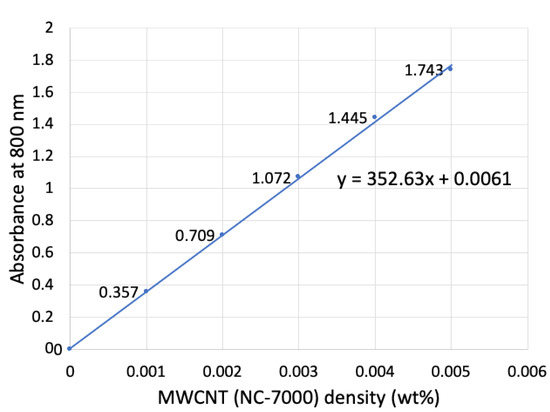 SEM (JSM-7401F, JEOL Tokyo, Japan) was used for observation of the uniformly dense MWCNT-coated CFs. Quantitative evaluation of the amount of MWCNTs on the CFs was conducted using UV-vis spectroscopy measurements at 800 nm (U-4100, Hitachi High-Tech Corporation, Tokyo, Japan) of the MWCNT dispersion after removal of the MWCNTs from CFs by the decomposition of Pipozo and using a calibration curve of absorption with known MWCNT concentrations, as shown in Figure 2. Figure 3 shows the calibration curve for MWCNT concentrations of 0.001, 0.002, 0.003, 0.004, and 0.005 wt% with absorptions of 0.357, 0.709, 1.072, 1.445, and 1.743, respectively (calibration line equation: y = 352.63x + 0.0061).