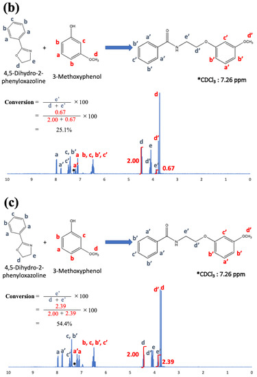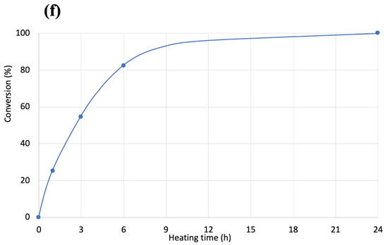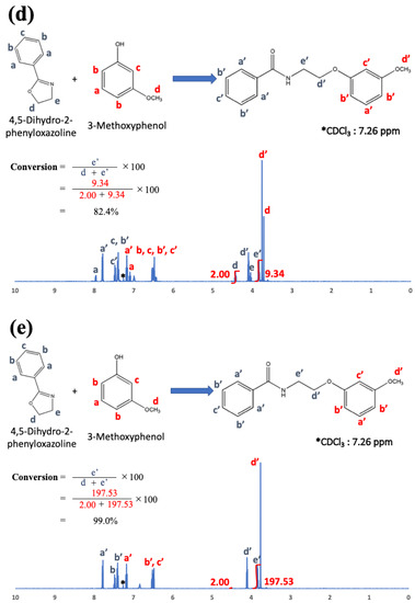 Figure 5. (a) 1H-NMR (500 MHz) spectra for the mixture of 4,5-dihydro-2-phenyloxazoline and 3-methoxyphenol immediately after mixing at room temperature, (b) after 1 h at 200 °C, (c) after 3 h at 200 °C, (d) after 6 h at 200 °C, and (e) after 24 h at 200 °C. (f) Reaction conversion based on 1H-NMR (500 MHz) measurements in (ae) calculated from the integral areas of the d and e’ peaks.