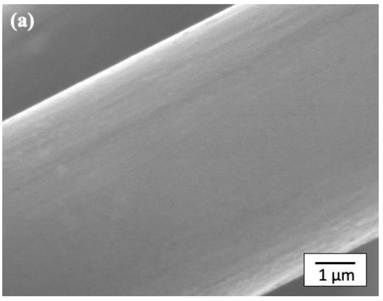 Figure 6 shows SEM micrographs of the CF surface after the layer-by-layer method. Figure 6a shows an SEM micrograph of a CF with the first layer of Pipozo, i.e., CF/Pipozo, which suggests a very smooth surface that originates from the CF surface. This indicates that the first layer of Pipozo is a uniform monolayer structure due to the reactivity of Pipozo, i.e., oxazoline and COOH on the CF surface and the complete washing process of unreacted Pipozo after the first layer reaction. TGA could not detect degradation of the first layer using CF/Pipozo, at least within the detection limit. In our previous study [22] using diamond particles, the uniform monolayer structure was formed by poly-2-vinyl-2-oxazoline, which is similar to Pipozo. TGA analysis could not detect the weight loss of poly-2-vinyl-2-oxazoline due to the limitation of the equipment when using 40 μm-diameter diamond particles, because the surface area is very small. However, when using 1 μm-diameter diamond particles, the weight loss due to the degradation of poly-2-vinyl-2-oxazoline was detectable, which suggests the thickness of the layer was ca. 1–2 nm. The uniformity was demonstrated using MWCNTs as a marker [22]. Therefore, it was considered that a similar uniform monolayer of Pipozo was formed on the CF surface.