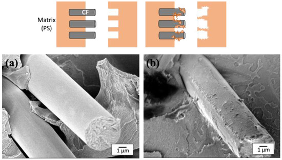 The effect of the uneven structure by the substantial amount of MWCNTs resulted in a strong chemical bonding to the CF surface, as evidenced by the fracture cross section near the CF; Figure 9 shows SEM images of the fracture cross sections of two composites (PS-CF, PS-CF/Pipozo/MWCNT), together with the two types of model structure, interfacial peeling and cohesive failure. The fracture surface of the CF in the PS-CF composite was smooth, which suggests the failure occurred at the interface. On the other hand, for the PS-CF/Pipozo/MWCNT composite, there was PS resin remaining on the surface, which suggested the failure occurred in the matrix, i.e., cohesive failure. This suggests that PS resin penetrated into the MWCNT layer, which resulted in strong adhesion at the interface.