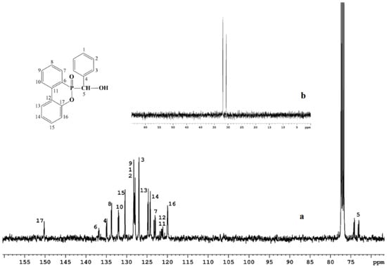 In the case of the carbon spectrum, all the signals appear as doublets or multiplets due to carbon–phosphorus coupling. As can be seen in Figure 2, the CH group has two characteristic doublets at 73.5 ppm and 73.7 ppm while the signals for the aromatic carbon atoms appear in the range 118 ppm to 151 ppm, the quaternary carbon directly linked to oxygen being the most de-shielded in the interval 150.1–150.3 ppm. The existence of the two isomers is clearly seen in the 31P NMR spectra, by the presence of two signals at 31.88 ppm and 30.65 ppm, respectively (Figure 2 inset).
