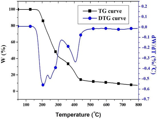 The thermal properties of PFR were investigated by TGA analysis. The TG and DTG curves of PFR showed that it decomposed in two steps (Figure 3). The first decomposition step was in the temperature range of 180–320 °C, which may be attributed to the catalysis of acidic phosphorus-based products evolved during the thermal decomposition of oxaphosphinine-6-oxide structure, while the second step took place in the interval of 320–520 °C as a result of the further thermal decomposition of the enriched aromatic carbonaceous structure []. The maximum weight loss rate in the first step of decomposition was 0.55 %/°C while the maximum weight loss rate of the second step of decomposition was lower (0.34 %/°C). The temperature at which the mass loss rate is the highest in the thermal decomposition process of the first step of decomposition was 208 °C, while that of the second step of decomposition appeared at 408 °C.