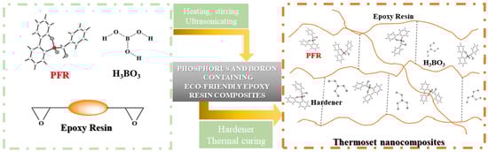 Epoxy-based composites were prepared by incorporation of PFR and H3BO3 in epoxy resin (Figure 4). The PFR content was adjusted so that the phosphorus atom concentration varies between 0 and 4 wt%. H3BO3 content was calculated to have a concentration of 2 wt% of boron in the thermosets (Table 1).