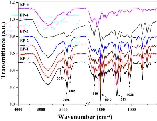 The resulting thermoset structures were investigated by FTIR spectroscopy (Figure 5). The neat EP-0 system presented characteristic absorption bands at 3350 cm−1 (O-H stretching vibrations), 3053 cm−1 (C–H tension of the methylene group of the epoxy ring (stretching vibrations)), 2926 (aliphatic C–H asymmetric stretching vibrations), 2865 cm−1 (aliphatic C–H symmetric stretching vibrations), 1610 and 1510 cm−1 (aromatic –C=C– stretching vibration), 1240 and 1036 cm−1 (aromatic ether C–O–C asymmetric and symmetric stretching vibrations, respectively). The EP containing phosphorus and boron additives (EP1-EP5) exhibited characteristic absorption peaks at 3340 (O–H and N–H stretching vibrations), 2960 and 2865 cm−1 (aliphatic C–H stretching vibrations), 1607 and 1510 cm−1 (aromatic C=C stretching vibrations), 933 cm−1 (aromatic P–O–C stretching vibrations), 754 cm−1 (deformation vibrations caused by the 1,2-disubstituted aromatic phosphaphenanthrene rings) and 699 cm−1 (deformation vibrations of the aromatic rings).