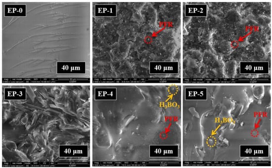 Scanning electron microscopy (SEM) characterization was used to investigate the morphology in the fracture surfaces of cured epoxy resin and its composites. Certain amounts of each sample were immersed under liquid nitrogen, then they were broken by applying mechanical stress. The SEM micrographs taken upon the fractured area of each sample are shown in Figure 6. The neat epoxy resin EP-0 had a smooth fracture surface, and showed a typical brittle fracture. When PFR was incorporated into epoxy resin, different rough fracture surfaces were observed (EP-1, EP-2 and EP-3). The maximum in fracture roughness increased with the amount of PFR content. In the case of EP-4 and EP-5 containing 2 wt% boron and 1.5 and 2 wt% phosphorus, respectively, some agglomerations of H3BO3 were observed.