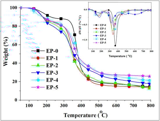 The char yield values at 800 °C were in the interval 12.9–25.6 wt%. The chars of the samples were relatively stable in the temperature interval of 500–800 °C. The lowest values of the char yield were obtained for the EP-0, EP-1 and EP-2 having lower phosphorus content. An increase in the char yield value was observed for the EP-3 containing 4 wt% phosphorus. The highest values of the char yield were obtained for EP-4 and EP-5 containing 2 wt% boron and 1.5 and 2 wt% phosphorus, respectively. This could be attributed to a synergistic effect of PFR containing phosphorus and H3BO3 in increasing the char yield values []. It is advantageous to have a higher char yield value because in this case a smaller amount of polymeric material is decomposed, thus resulting in a smaller volume of combustible gases that can cause a fire. This effect has been also observed by other researchers when H3BO3 was used together with a phosphorus-containing compound to improve the flame-resistant characteristics of epoxy resins [].