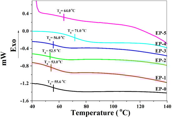 The glass transition temperature (Tg) of the samples was in the interval 52.5–71.0 °C (Table 2, Figure 8). An increase in Tg appeared for the samples containing both H3BO3 and PFR (EP-4 and EP-5), probably because of increased co-interaction between H3BO3 and PFR with the polymer matrix that resulted in an increase in the rigidity of the macromolecular chains thus increasing the Tg values.