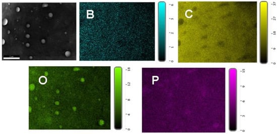 The char residue formed during a fire behaves as a protective layer against the transport of heat and combustible gases. The effectiveness of this protection depends on the quantity and morphology of the char. The SEM images of pyrolyzed composite chars obtained by heating the samples up to 800 °C with the heating rate of 10 °C/min in nitrogen atmosphere are shown in Figure 9. As can be seen from Figure 9, the EP-0 char is porous, having many holes, while the chars of samples containing phosphorus EP-1, EP-2 and EP-3 were more compact and denser. Thus, PFR, a compound derived from DOPO, improved the morphology of the chars. The chars of EP-4 and EP-5 were also compact and dense when compared with those of EP-0. A mapping technique was used to investigate the atom distribution on the char surface. From Figure 10, which presents the EDX mapping of EP-5 char, it can be observed that the phosphorus and boron atoms have been present and are uniformly distributed on the char residue surface.