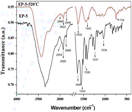 FTIR spectra of EP-5 and EP-5 heated up to 520 °C.