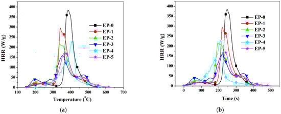 (a) Heat release rates versus temperature for epoxy composites; (b) Heat release rates versus time for epoxy composites.