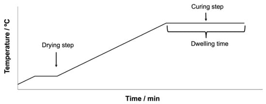The final step was curing, which promotes coalescence of the binder particles and yields a continuous coating. This was performed in a convection oven using a programmed ramp (see Figure 2). The curing cycles were determined by testing the capability of the material to flow and ensuring a stable film formation. The thermal cycles of each binder are described in Table 2. From 100 °C to the temperature plateau indicated, the heating ramp used was 5.0 °C/min. The final thickness of the coatings was measured using an inductive gauge thickness measurement device Elcometer (Manchester, UK) 456, achieving values of 25 +/− 5 micron for all formulations.