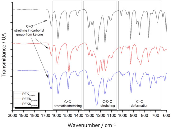 It is possible to identify characteristic bands that correspond to chemical groups which are common to these three polymers: C=O stretching in ketone’s carbonyl group (around 1650 cm−1), C=C stretching in benzene rings (region between 1400 cm−1 and 1600 cm−1), and C=C bending in benzene rings (region between 650 cm−1 and 1050 cm−1) [39,40]. The spectra show different features in these regions, due to the different arrangements of ether and ketone groups in the repetitive units of PEK and PEEK. For example, in PEK, the benzene ring always has a ketone group on one side and an ether group on the other side. In the case of PEEK, the benzene ring can be between a ketone and an ether group or between two ether groups. Lastly, in PEKK, it is possible to obtain a third case, which involves the benzene ring being surrounded by two ketone groups. This directly affects the features of the bands pertaining to the benzene rings. In the region from 1100 cm−1 to 1300 cm−1, it is possible to see a group of bands that correspond to the C-O-C ether group. In the PEEK spectrum, a band appears at around 1180 cm−1, which is not present in PEK or PEKK [39].