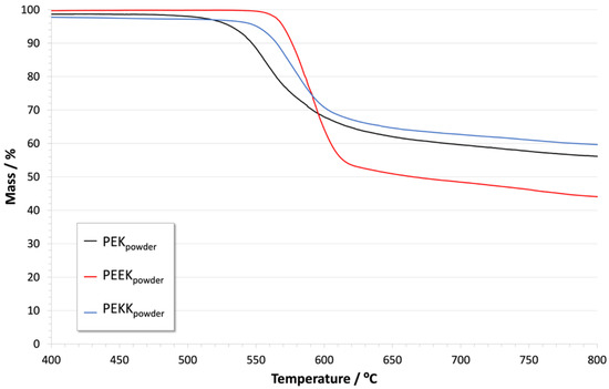 Thermogravimetric analysis of PEK, PEEK and PEKK powders in nitrogen.